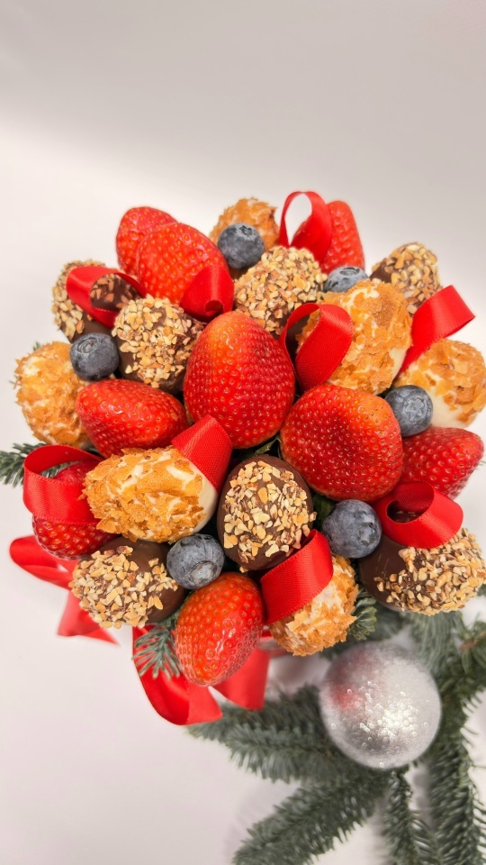 Клубника в белом и молочном шоколаде, свежая клубника 450гр. с посыпками вафля и арахис, голубика 30 гр.