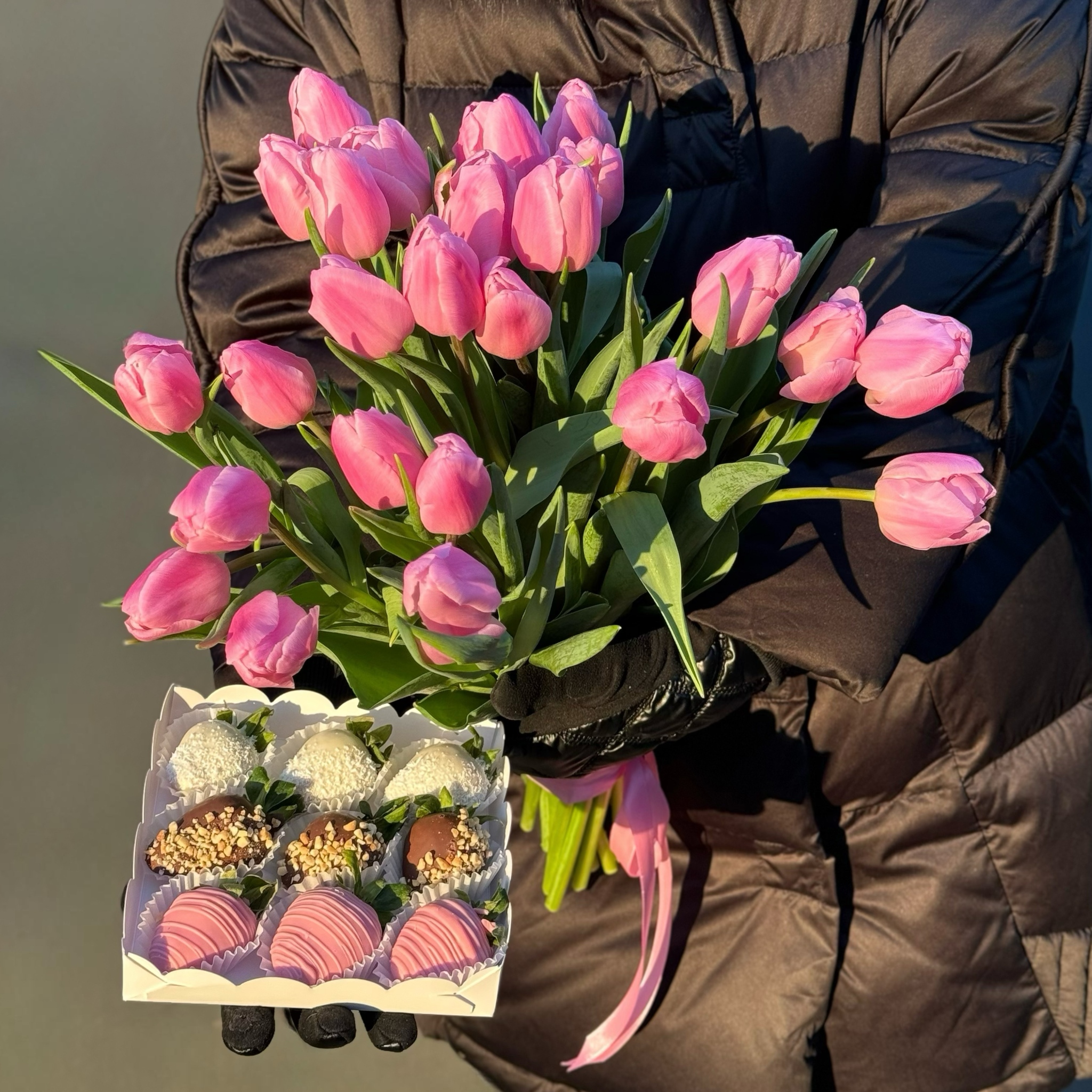 комбо 25 тюльпанов + коробочка на 9 клубник