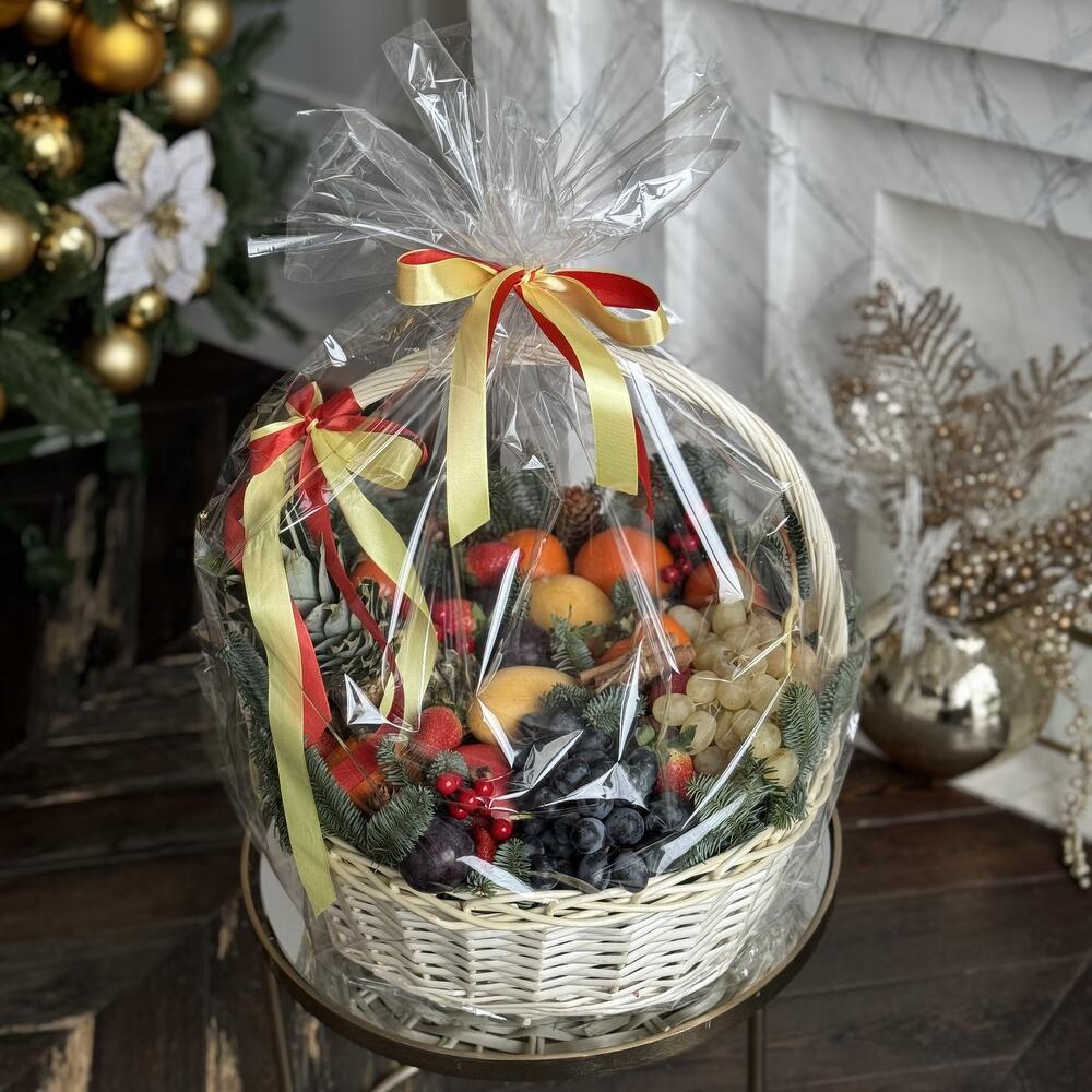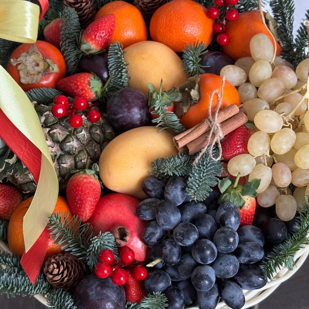 Корзина - 1 шт. Ананас - 1 шт. Гранат - 2 шт. Слива - 10 шт. манго - 2 шт. Хурма - 5 шт. Новогодний декор - 8 шт. Нобилис - 10 шт. яблоки - 4 шт. мандарины - 6 шт. грозди винограда белого - 750 гр. грозди черного винограда - 750 гр.
